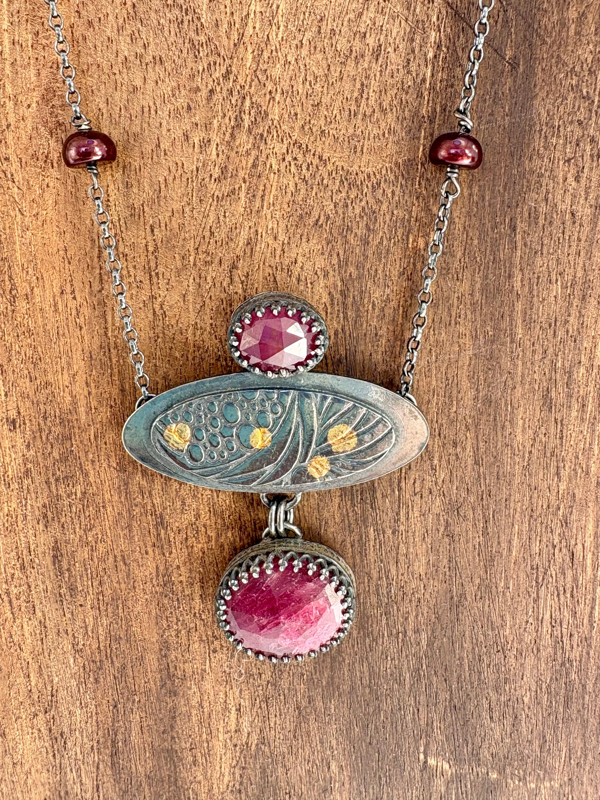 Blackened silver with Keum Boo gold details and ruby gemstones and small freshwater pearls