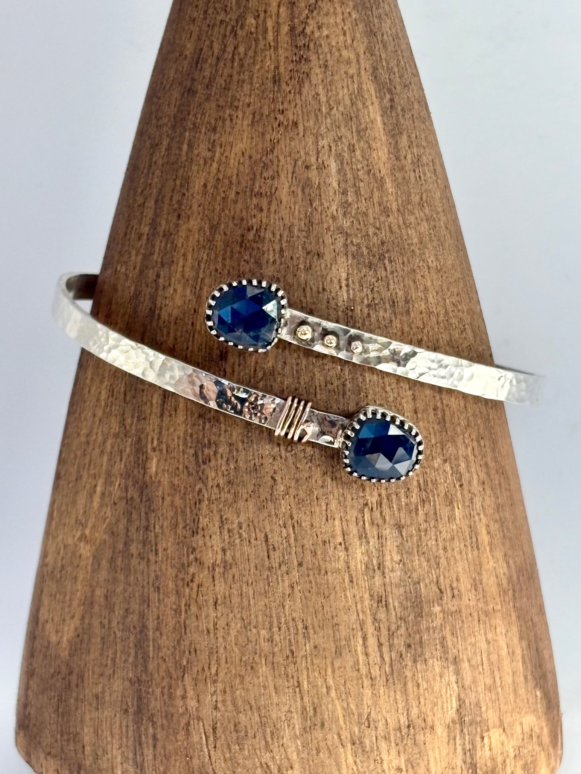 Silver bangle with a hammered texture and two rose cut Kyanite gemstone at each end. Small gold details are added to the shoulders of the bangle The bangle can be made larger or smaller
