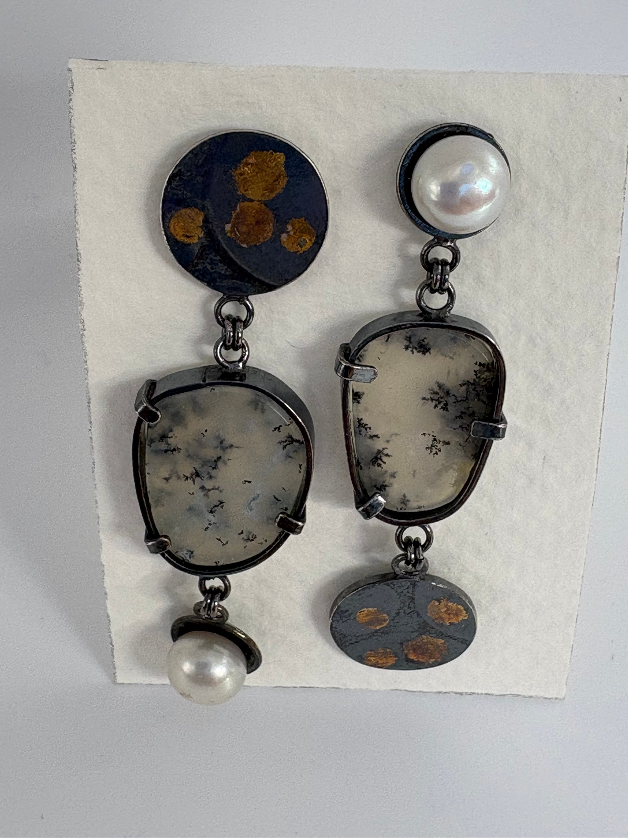 The earrings have slices of Dendritic Opal and freshwater pearls.