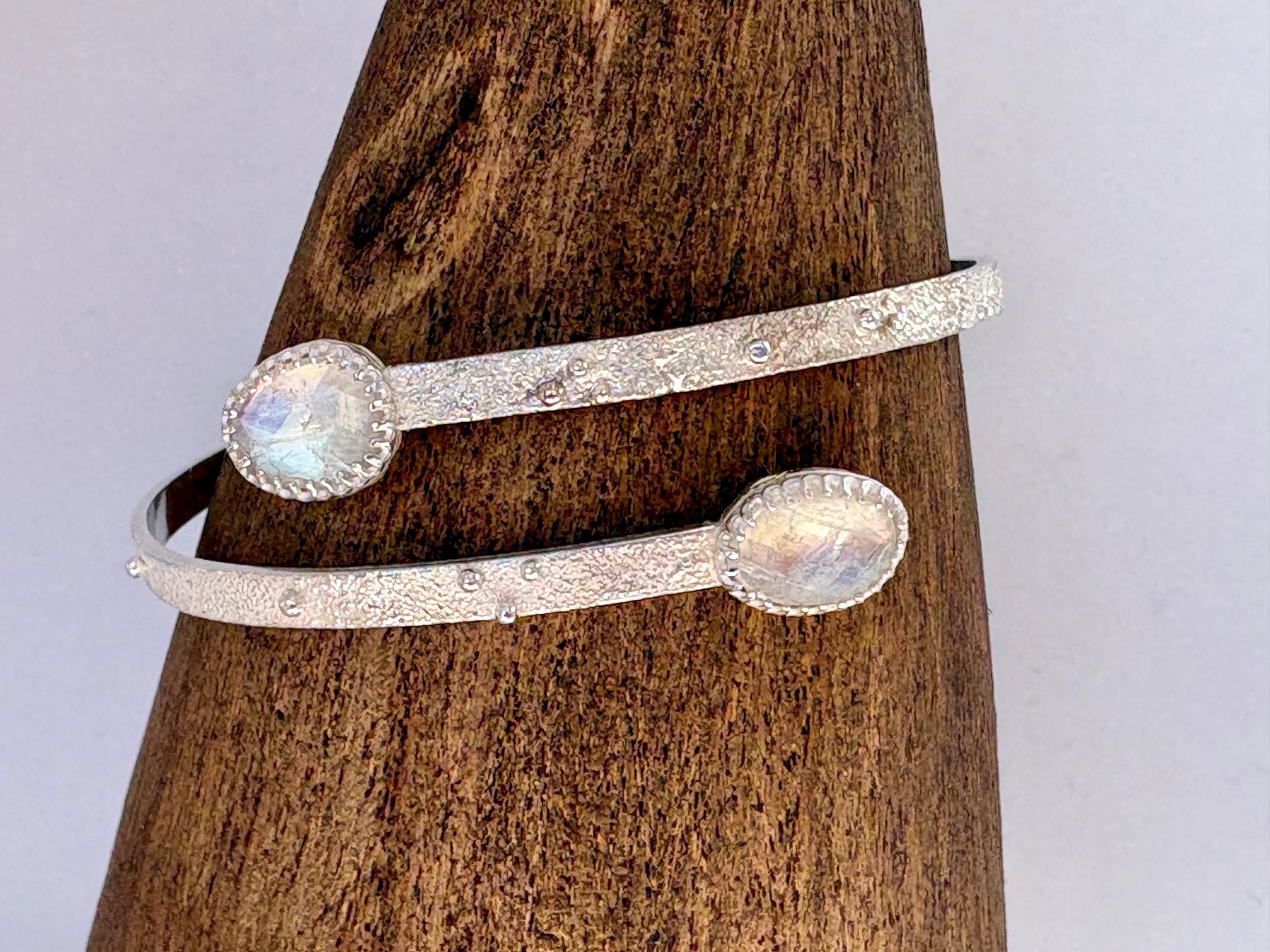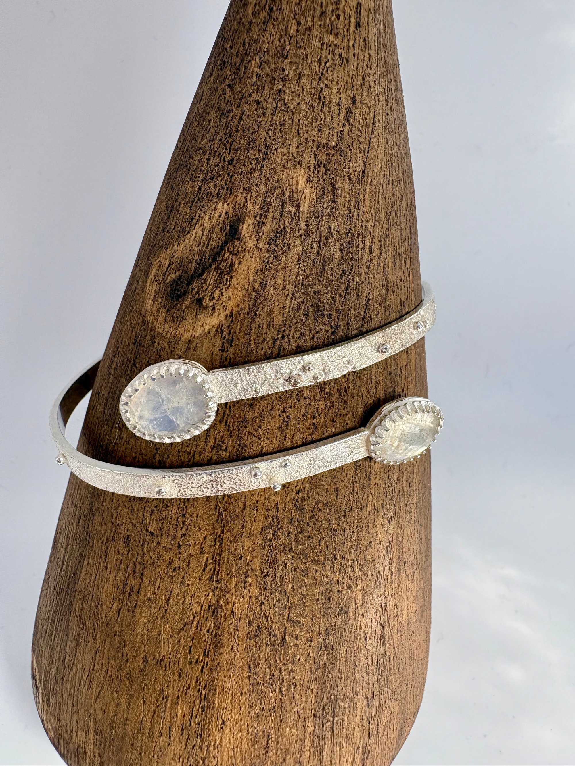 Reticulated silver bangle with two rose cut Moonstone gemstones.